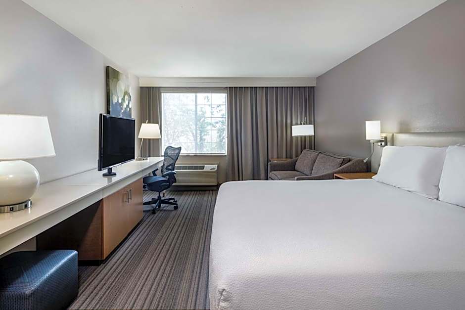 This mobility accessible standard room features one king-sized bed and a roll-in shower. This room offers the latest in technology and ergonomic comfort to our guests. Roll-in shower with attached accessible seating, lowered vanity in bathroom, and lowered shelf in closet. And the pursuit of the perfect night's stay continues with an evolution of innovative new amenities including the bed, chair, television and crisp white duvet. The ergonomic Mirra chair by Herman Miller is good for your back and better for work. Enjoy an in-room movie or your favorite television show on our 36-inch HDTV. There's also a microwave, refrigerator and coffee/teamaker to help you feel at home. And for conducting business, our rooms ensure your productivity thanks to the spacious work desk, two telephones with dataport and voicemail and complimentary WiFi access. Any corresponding photo may not reflect the specific accessible room type or room feature.