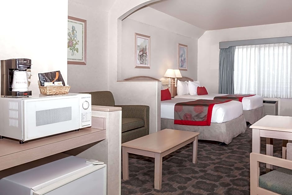The Ramada by Wyndham Bakersfield offers a variety of rooms including King Suites, Deluxe Suites with Two Double Beds, Two Double Bed Suites, King Rooms with Mobility/Hearing Impaired Access, and Deluxe King Suites. All rooms are non-smoking and vary in size from 323 sqft to 355 sqft. Accommodations range from 4 adults and 3 children to 6 adults and 4 children. Bed options include King size beds and Double beds.