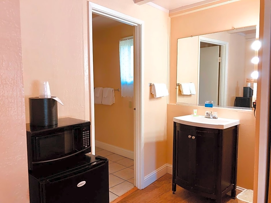 This suite features a living room with a sofa bed, a 32-inch HDTV with cable channels, a kitchenette with pots, pans and silverware, a coffee machine, a microwave, a refrigerator and an private bathroom with a shower/tub combo.