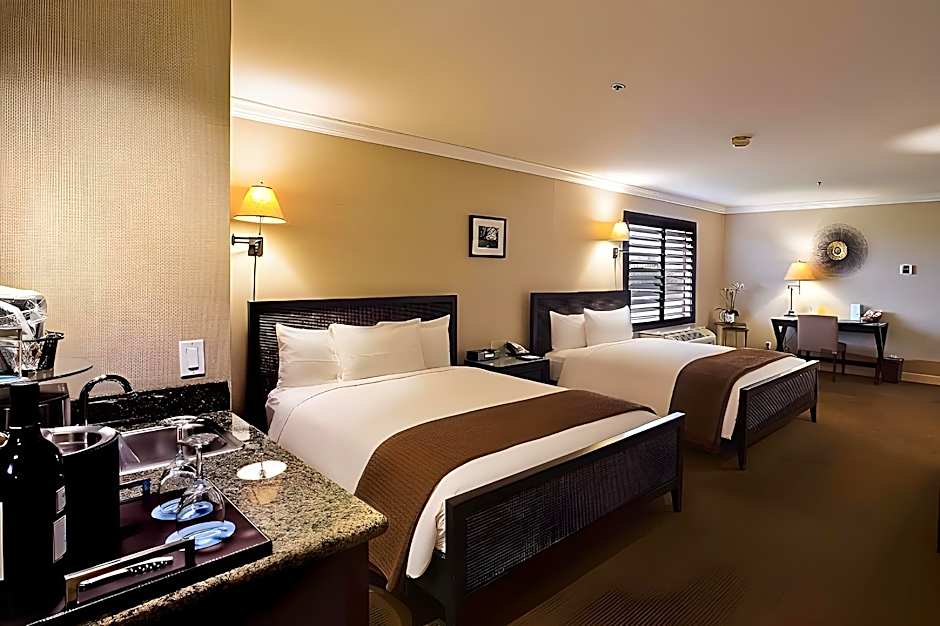 This spacious air-conditioned deluxe suite includes a full-size bathroom with granite counter-tops and dual vanity mirrors, an LCD TV, an iHome docking station and a mini-fridge.