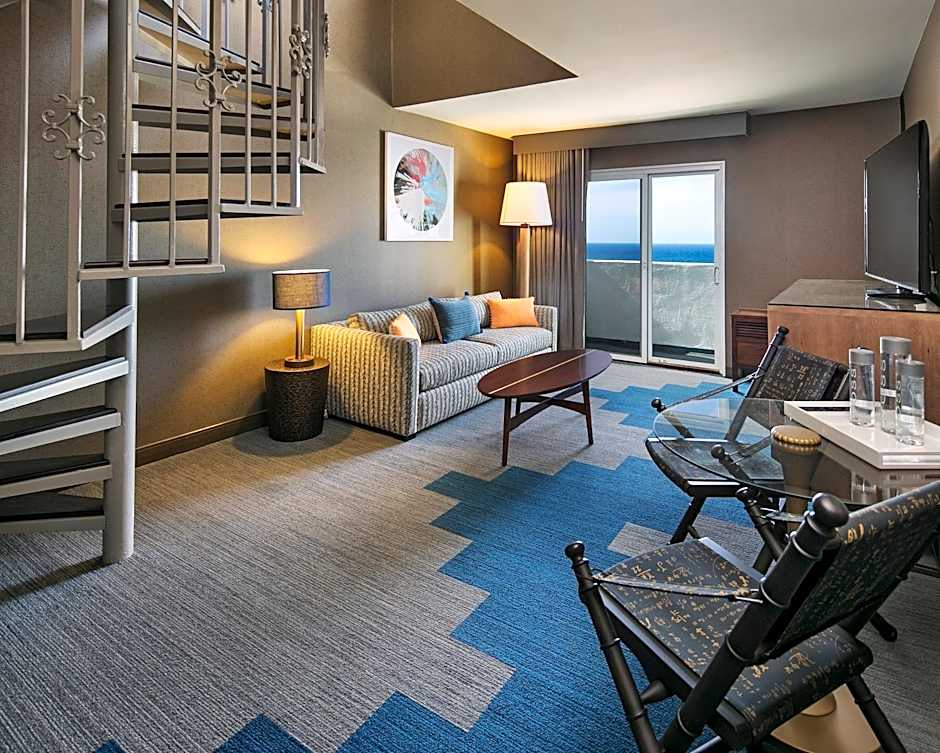 Featuring a loft with a spiral staircase, Standard shower and tub combination in bathroom, the top floor has a king bed. The lower level features a sofa, refrigerator and coffee maker. A private terrace is available.