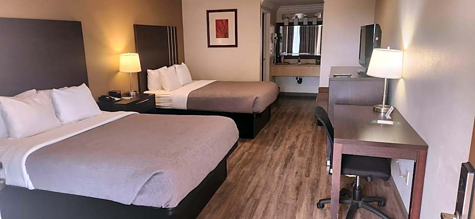 The Quality Inn Long Beach - Signal Hill offers Standard Rooms with two Queen beds or one King bed, all of which are non-smoking. Each room has a size of 301 sqft and can accommodate either 4 adults and 3 children or 2 adults and 1 child, depending on the bed configuration. One of the King bed rooms also has an accessible tub.