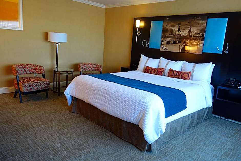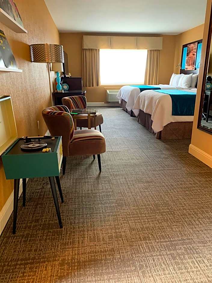 Offering a larger room with a balcony (upon request), vinyl record player, bathrobes, refrigerator, microwave, in-room coffee, APP streaming, 40" TV with HD cable channels, USB outlets, free WiFi, ECO friendly water bottles, air-conditioning, safe and work desk. Free parking night of stay, guest paid Grab-n-Go continental breakfast and mixed cocktails, beer and wine. Public paid airport shuttle nearby.