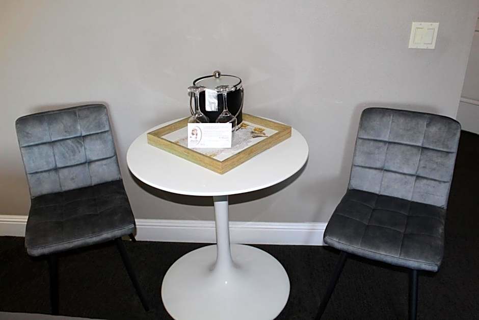 The Junior Suite is located on the second floor with elevator access. This spacious room features a Fireplace, king sized bed, a seating area, alarm clocks with charging ports, 43 inch TV, coffee makers and wine glasses. The bathroom has 2 person soaking tub and separate standing shower with eco friendly amenity dispensers, thick towels and luxurious robes. The double sink provides ample space for you and your travel companion to get ready for your day in wine country.