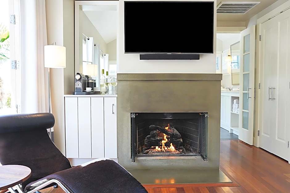 French doors open private patio in this luxurious cottage. A fireplace, premium linens, coffee-making facilities and a built-in entertainment system is featured. A luxurious outdoor shower and private bathroom with heated stone tile floors is also featured in this cottage.