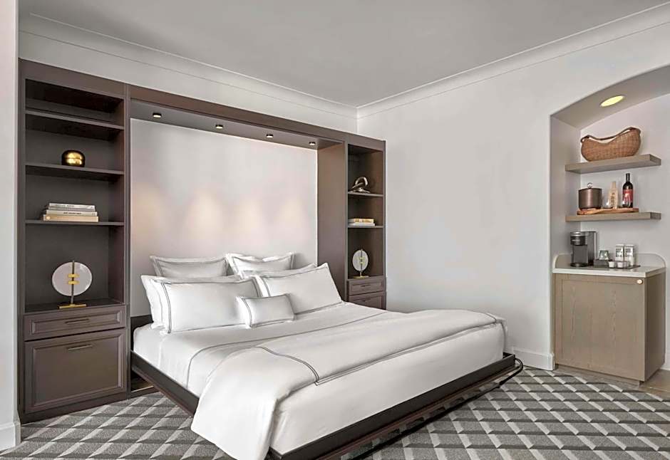 This 2-level suite includes an upstairs seating area and a hospitality bar area with a microwave, refrigerator and a large flat-screen TV. A king bed, full bathroom and a seating area are located downstairs, as is a balcony overlooking the courtyard.
