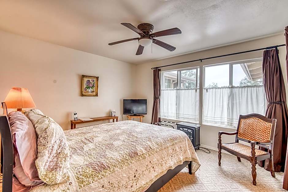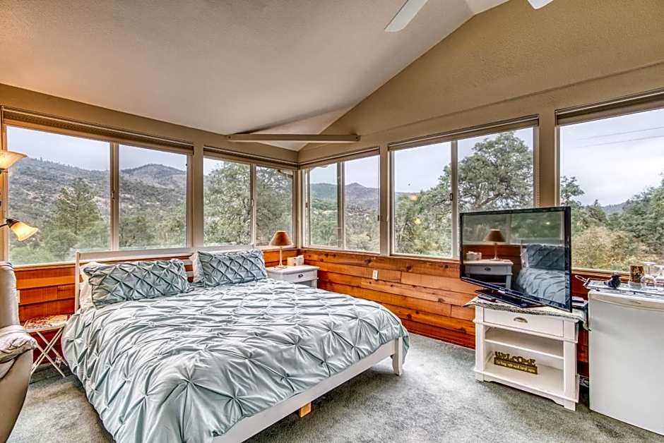 This king room features 9 large windows with majestic views of the Sierra Mountains all around and a wonderful view of the sunrise. A satellite TV and a refrigerator are provided. This room can accommodate children. The max occupancy is 4 people including children.