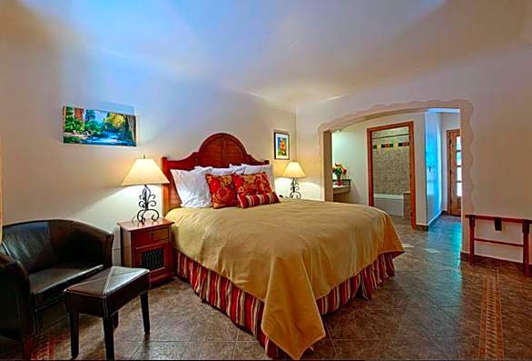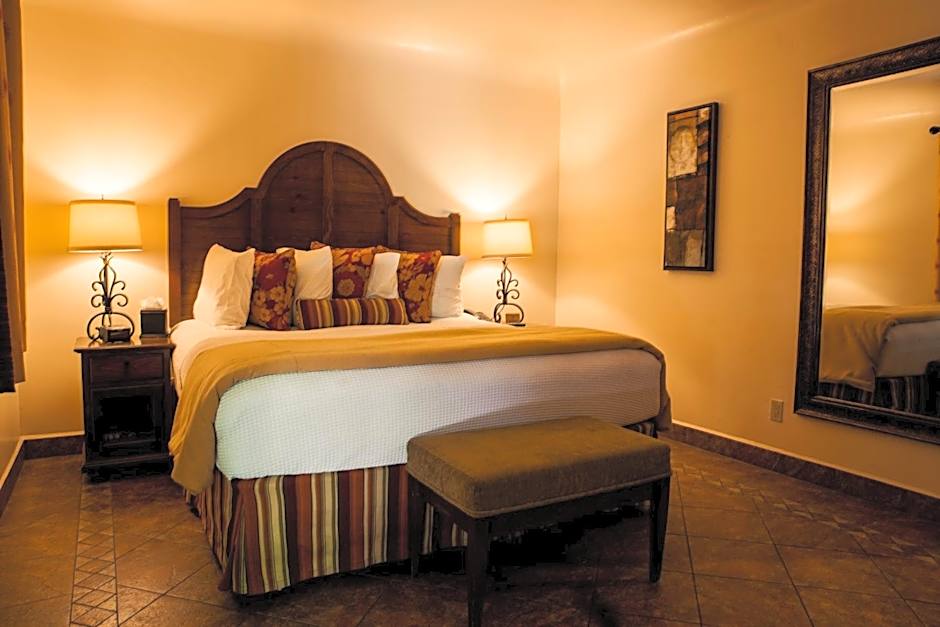 Featuring pool, mountain and garden views, this elegant room is styled in off white linens, rich wood furnishings and a mosaic tile private bathroom.