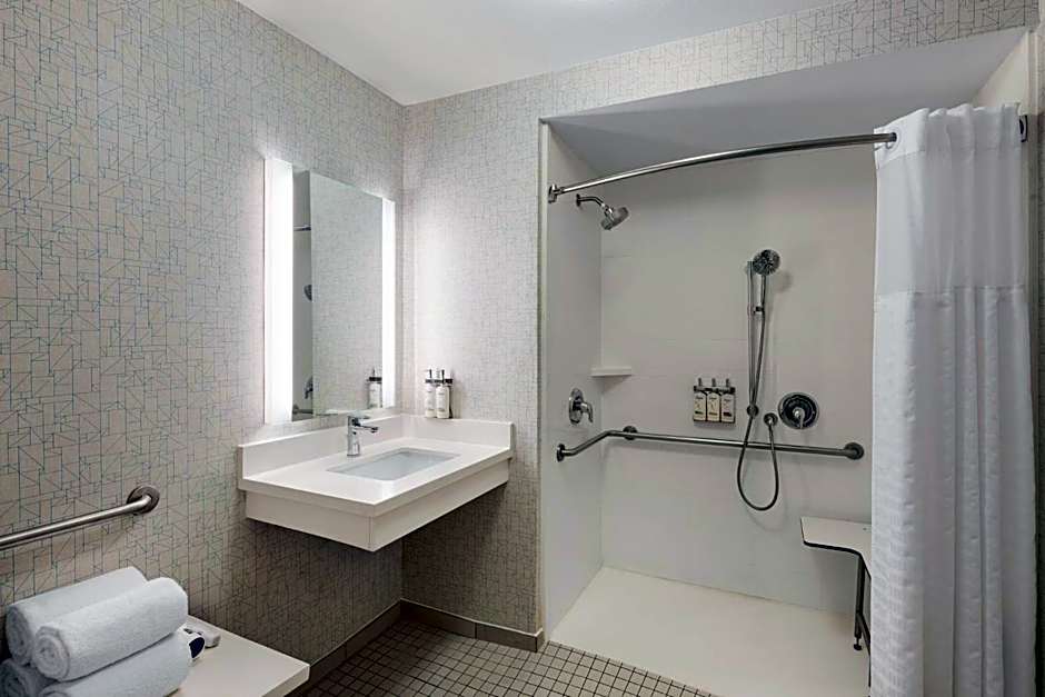 Includes hand-held shower head, tub and toilet with grab bars, raised toilet seat, removable shower seat and visual alarm.