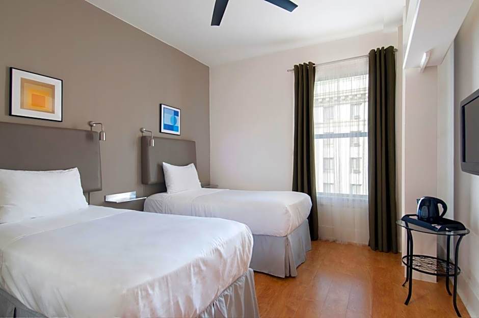 Offering views of Union Square, this deluxe room includes a cable TV and a white tiled bathroom.