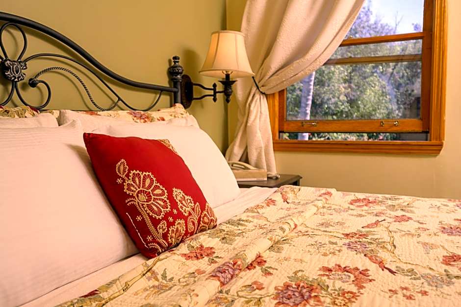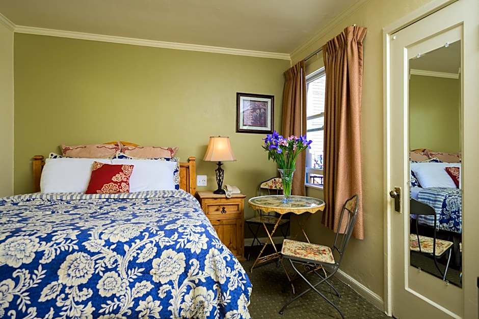 "This charming room opens onto our flower-filled courtyard and features a comfortable queen bed, a flat-screen TV, microwave, mini-fridge, and coffee maker. In the closet, you'll find ironing tools, extra blankets and pillows, and a fan for added comfort. Please note: pets are not allowed in this room type."