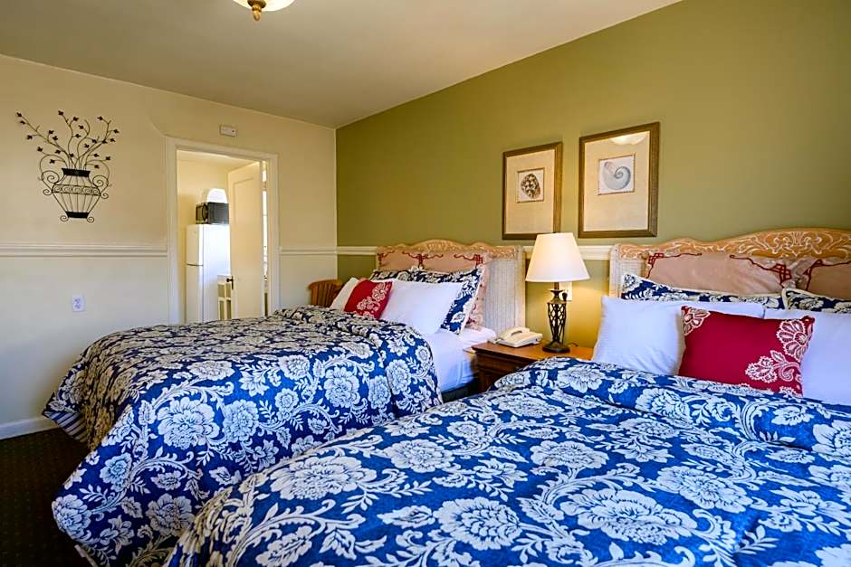 "This welcoming room opens onto our flower-filled courtyard and features two comfortable double beds. Amenities include a flat-screen TV, microwave, mini-fridge, and coffee maker. In the closet, you’ll find ironing tools, extra blankets and pillows, and a fan for your comfort. Please note: pets are not allowed in this room type."