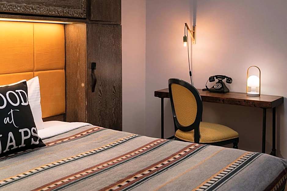This double room has a flat-screen TV and air conditioning, free bath amenities, retro-inspired telephones, work desk, 55" flat-screen TV, Access to communal kitchen, includes a twin-sized murphy bed.