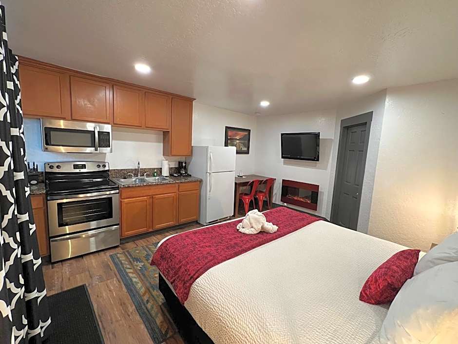 This suite features a fireplace. Guests can make meals in the kitchen that has a refrigerator, kitchenware, a microwave and a tea and coffee maker. This air-conditioned suite is consisted of of a flat-screen TV with cable channels and a private bathroom. The unit has 1 bed.
