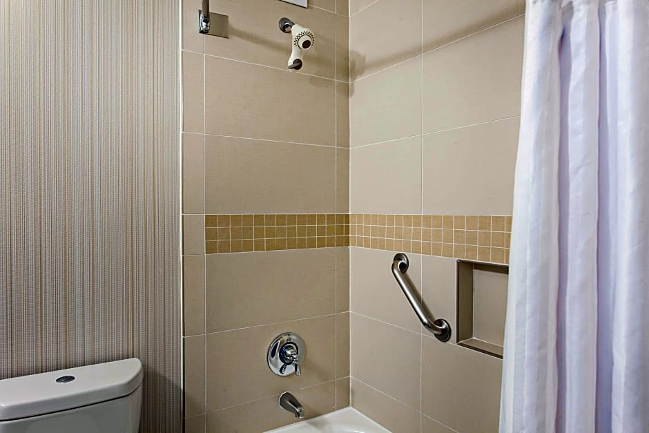 This mobility and hearing accessible suite features a roll-in shower. A visual alarm, notification devices for the doorbell or door knock and incoming telephone calls are offered. A microwave, a refrigerator and coffee and tea-making facilities are provided.