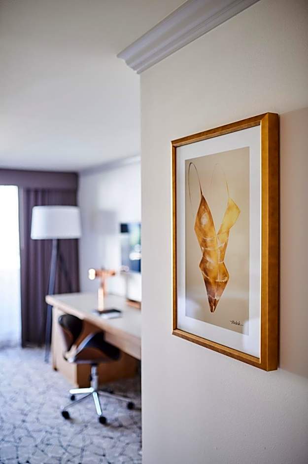 This suite features a private balcony with city views, a spacious seating area with a sofa bed and a bathroom with marble floors. Floor-to-ceiling glass doors, a gourmet coffee maker and a walk-in closet are also included.