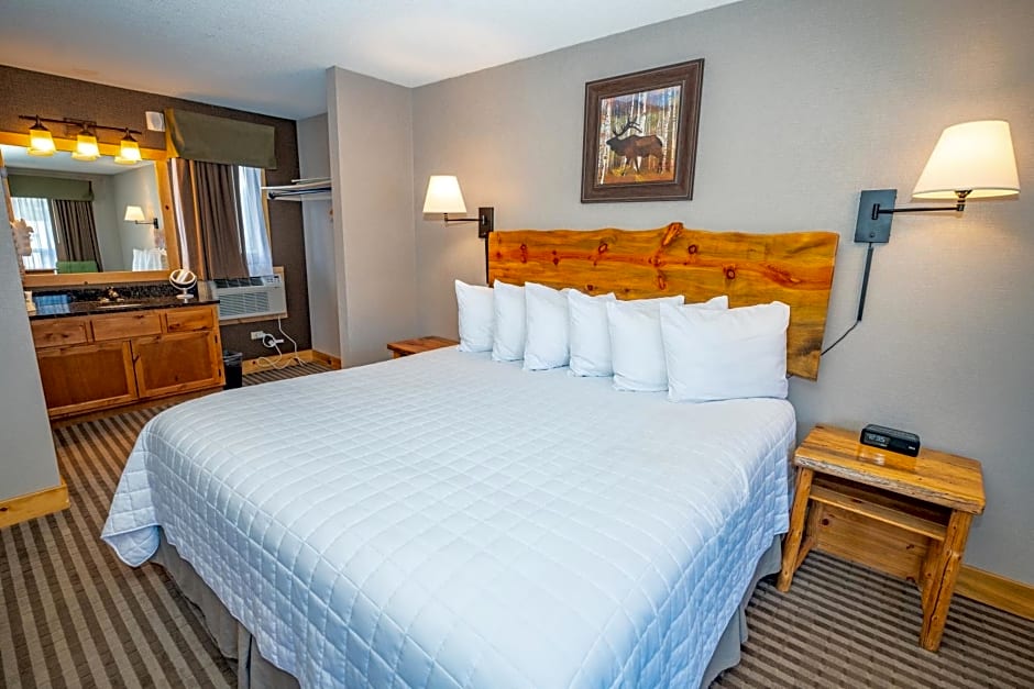 Room options offer flexible choices for different groups. The Junior Suite, 2 Queen, Kitchen sleeps with two queen beds and a kitchen, accommodating 2 adults and 1 child. The Room - 2 Queen, Kitchen spans 527 square feet and accommodates up to five adults and two children, with two queen beds and a futon mat. Additional configurations include the Room - 2 Queen (2 adults, 1 child) and the King Room (1 king bed), ensuring a variety of setups for a mountain getaway.