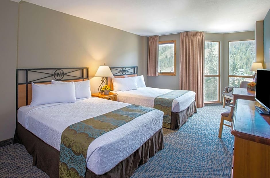 The Winter Park Mountain Lodge offers a variety of room types including Standard Queen Rooms with two Queen beds and either a Woods/Forest View or a Mountain View, King Suites, King Rooms with accessible features, and Double Rooms with two Double beds. All rooms are non-smoking and have a size of 301 sqft. The occupancy ranges from 2 adults and 1 child to 4 adults and 3 children, depending on the room type.