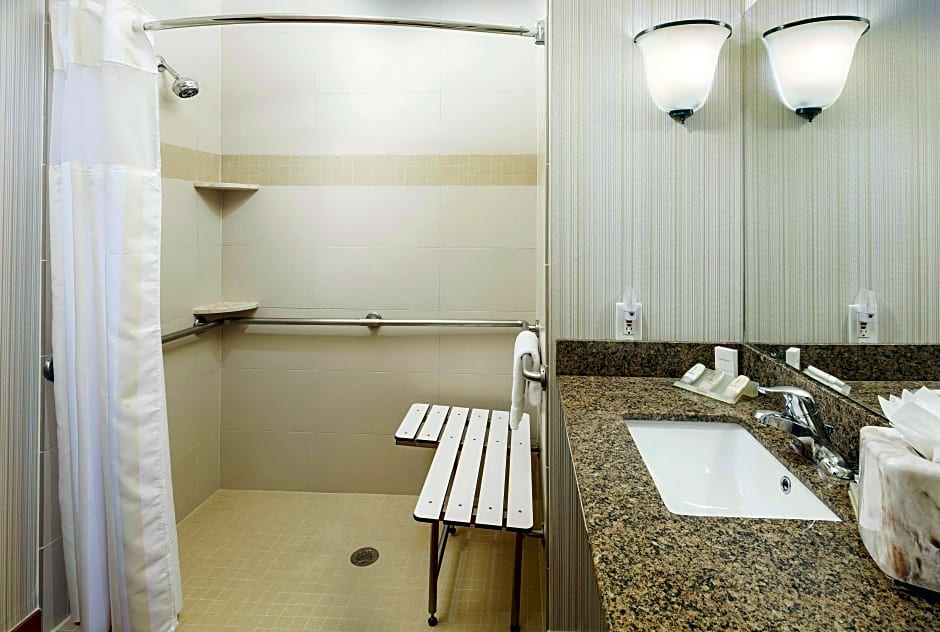 This room offers cable TV, a microwave, and a refrigerator. Disability access features include a roll-in shower with grab bars and an emergency telephone in the bathroom.