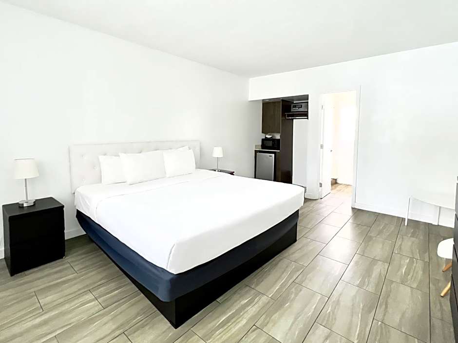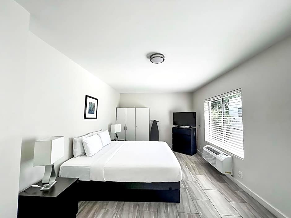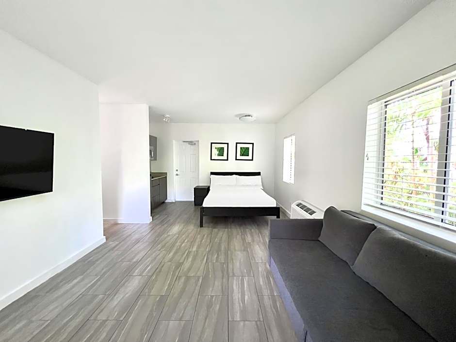 This studio features a flat-screen TV and kitchenette which includes a refrigerator, microwave, and toaster.