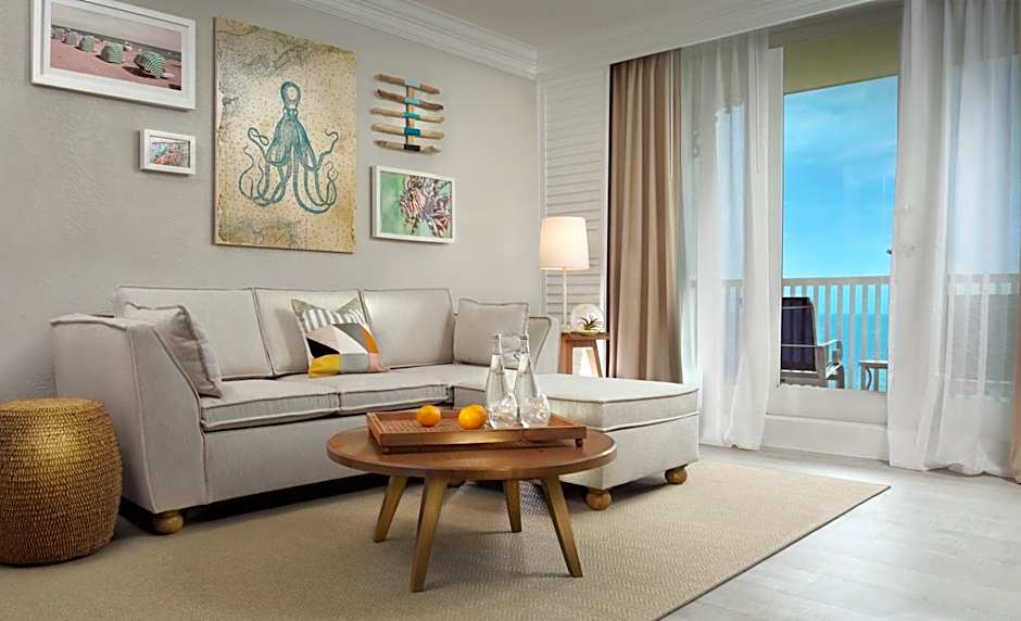 This ocean-front suite features a seating area with sofa bed and a private balcony. A small refrigerator and 42-inch flat-screen TV are provided.