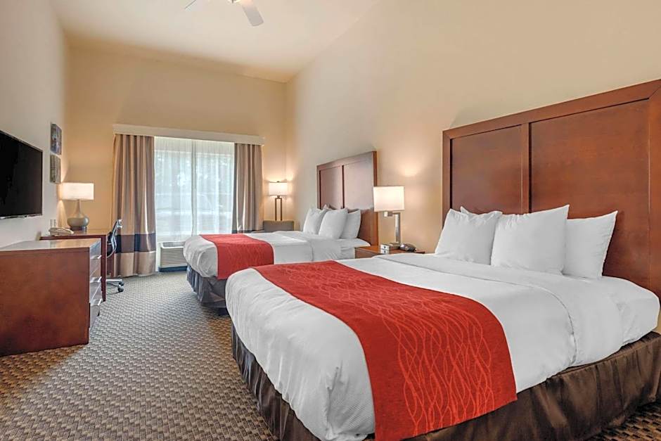The Comfort Inn & Suites Fort Myers Airport offers several types of rooms. They have Standard King Rooms, King Rooms with Roll-In Shower, Queen Suites, and King Suites. All rooms have a room size of 355 sqft or 388 sqft. Smoking is not allowed in any of the rooms. The rooms can accommodate 2 adults and 1 child or 4 adults and 3 children, depending on the room type. The beds range from 1 King size bed to 2 Queen size beds, with some rooms also having a sofa bed.