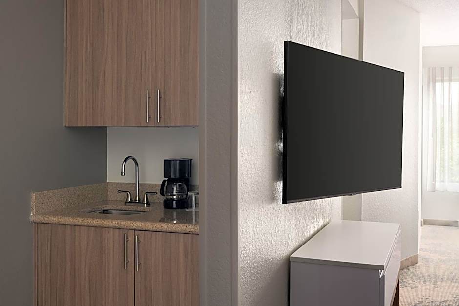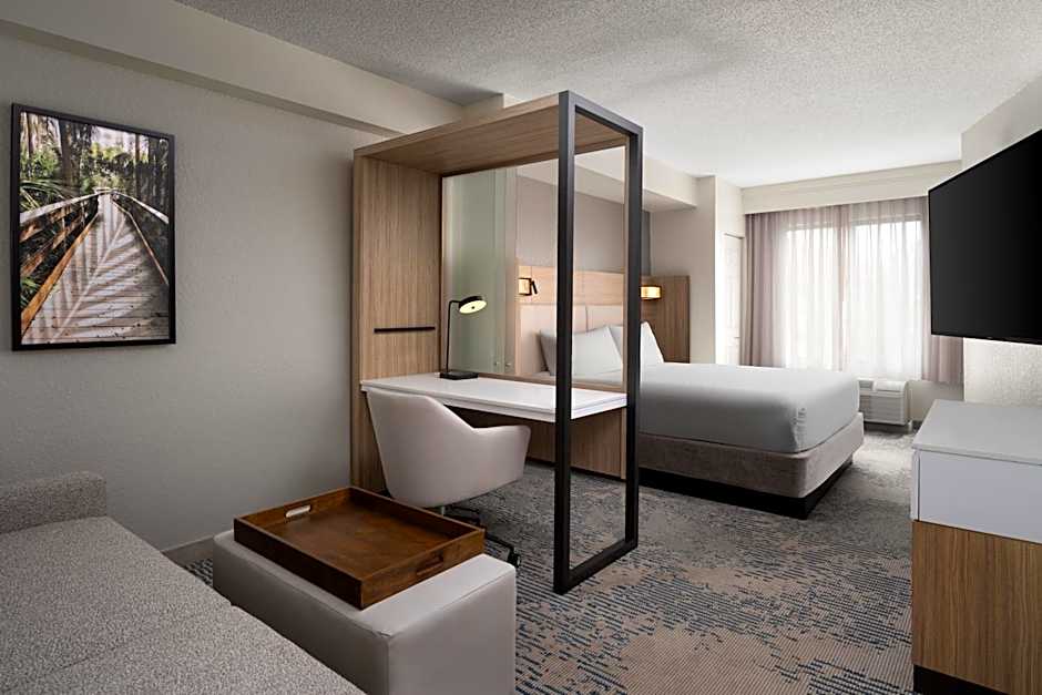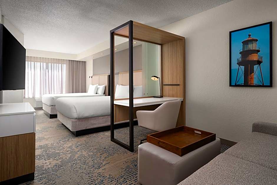 SpringHill Suites Fort Myers Airport offers a variety of rooms including Suites and Family rooms. The King Suite with Sofa Bed and the Double Room with Two Double Beds with Sofa Bed are both spacious, with the latter being slightly larger. Smoking is not allowed in any of the rooms. The King Suite with Sofa Bed - Hearing Accessible is also available for guests with hearing accessibility needs. All rooms accommodate multiple adults and children.