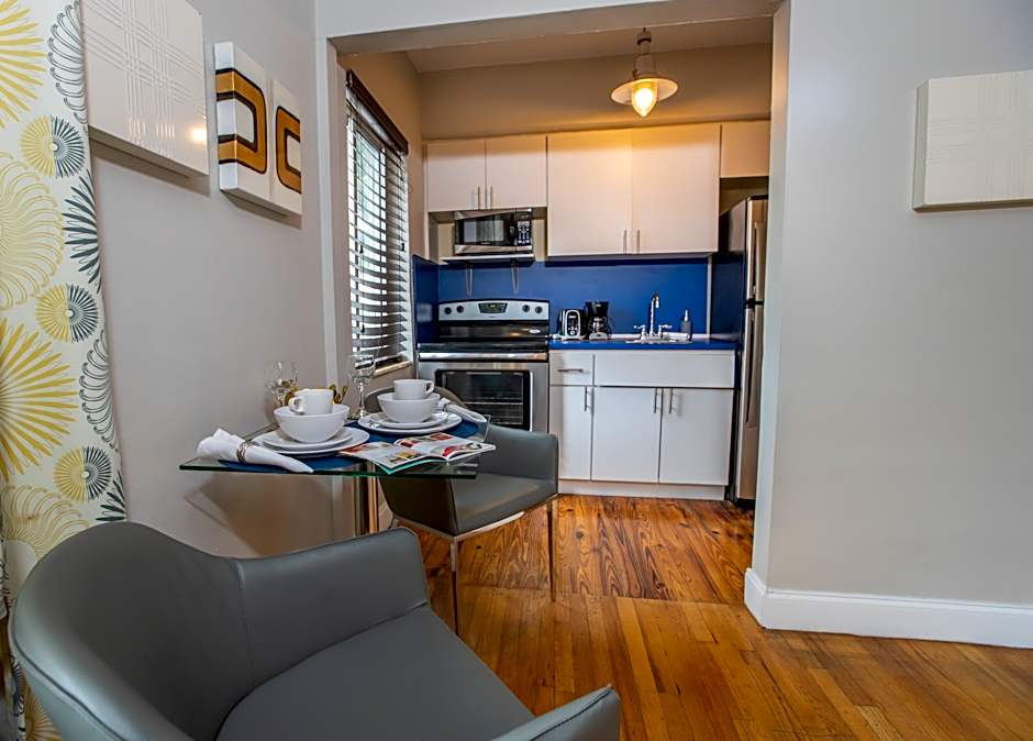 This uniquely decorated studio features pine wood flooring, WiFi access, and a 42-inch flat-screen satellite TV. The full kitchen includes a stovetop, microwave, coffee machine, toaster, and kitchenware.