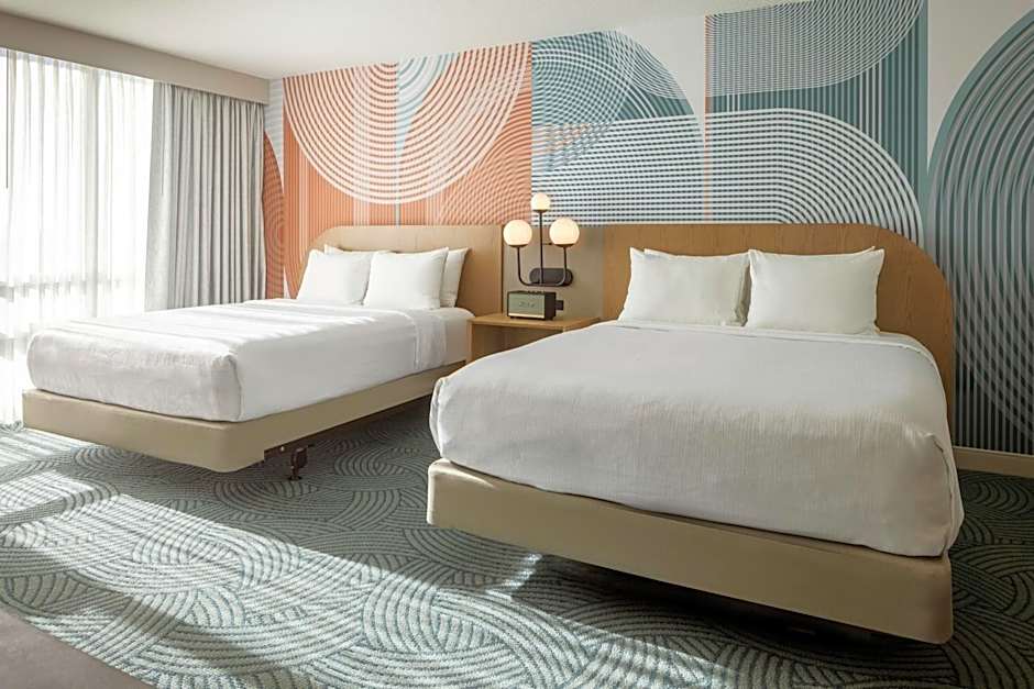 The Hotel Kinetic Orlando Universal Blvd offers a variety of rooms including Queen Rooms with Two Queen Beds, Junior Queen Suites with Sofa Beds, Deluxe King Rooms with Skyline Views, and King Rooms. All rooms are non-smoking and range in size from 258 sqft to 312 sqft. The rooms can accommodate either 2 adults and 1 child or 4 adults and 3 children, and have either Queen size or King size beds.