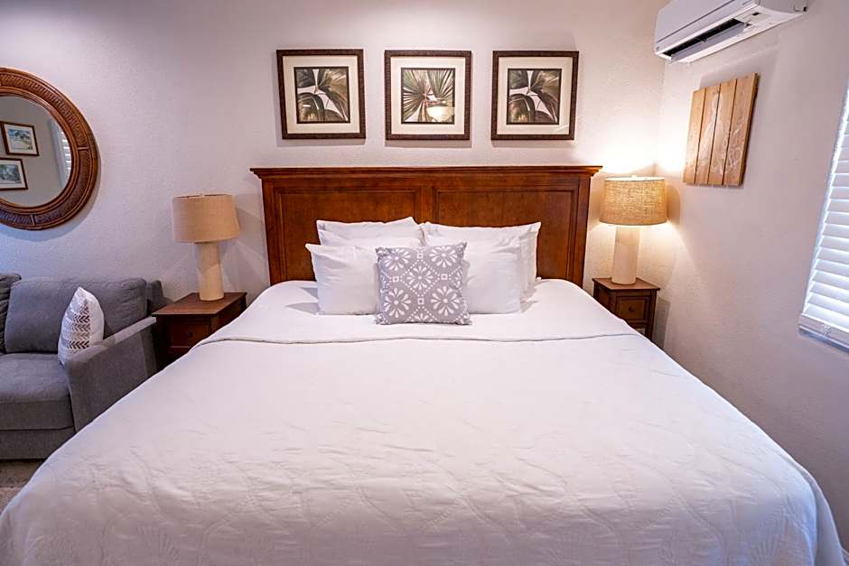This spacious, beautifully decorated Villa with a porch area and courtyard view has a king size bed, queen size sleeper sofa and 42 inch flat screen TV. It also provides you with a fully stocked kitchenette complete with fridge/freezer, oven, stove, microwave and dishwasher, as well as a dining table for 4.