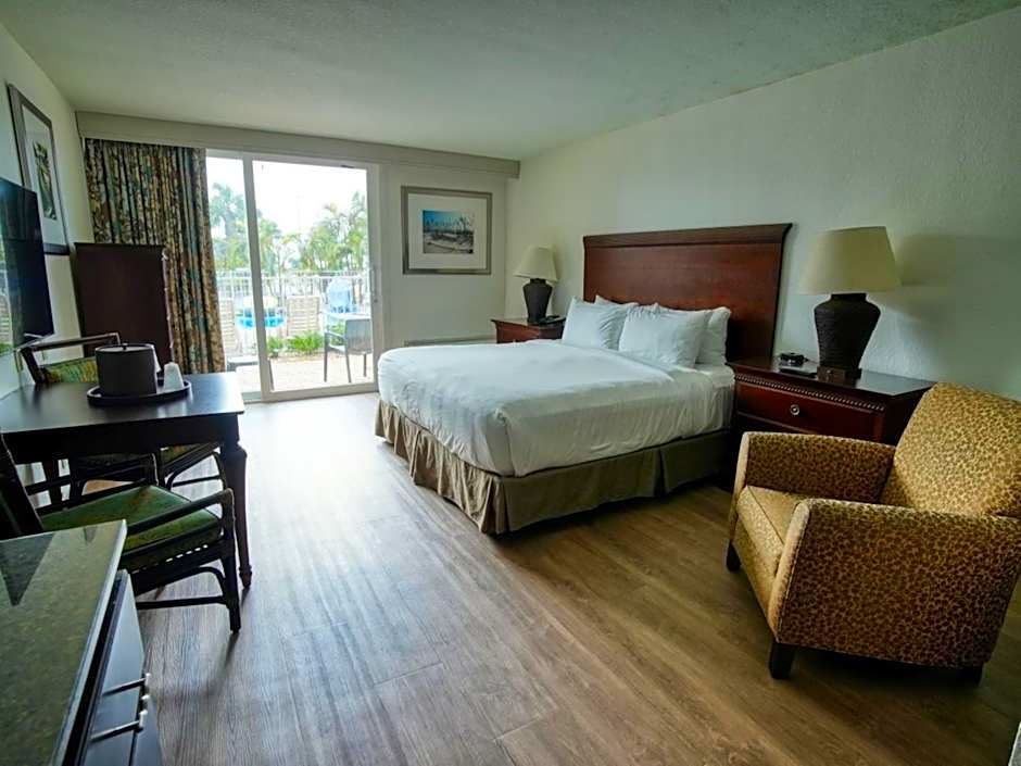 Offering a view of the pool, this guestroom includes a microwave, small refrigerator, and coffee-making facilities. A 42-inch flat-screen with cable is provided.