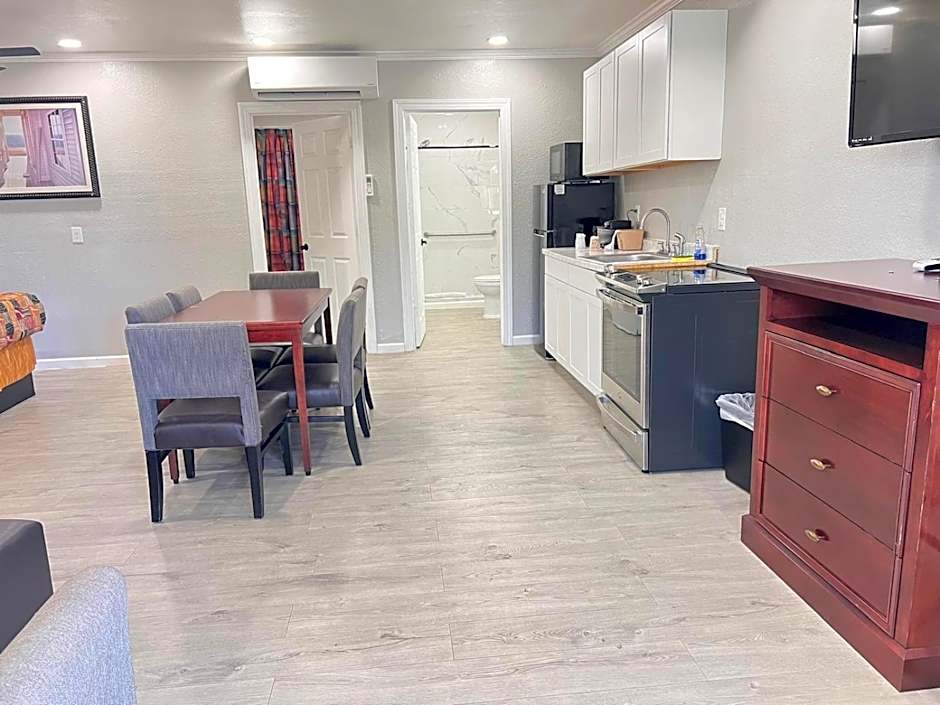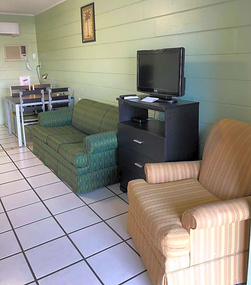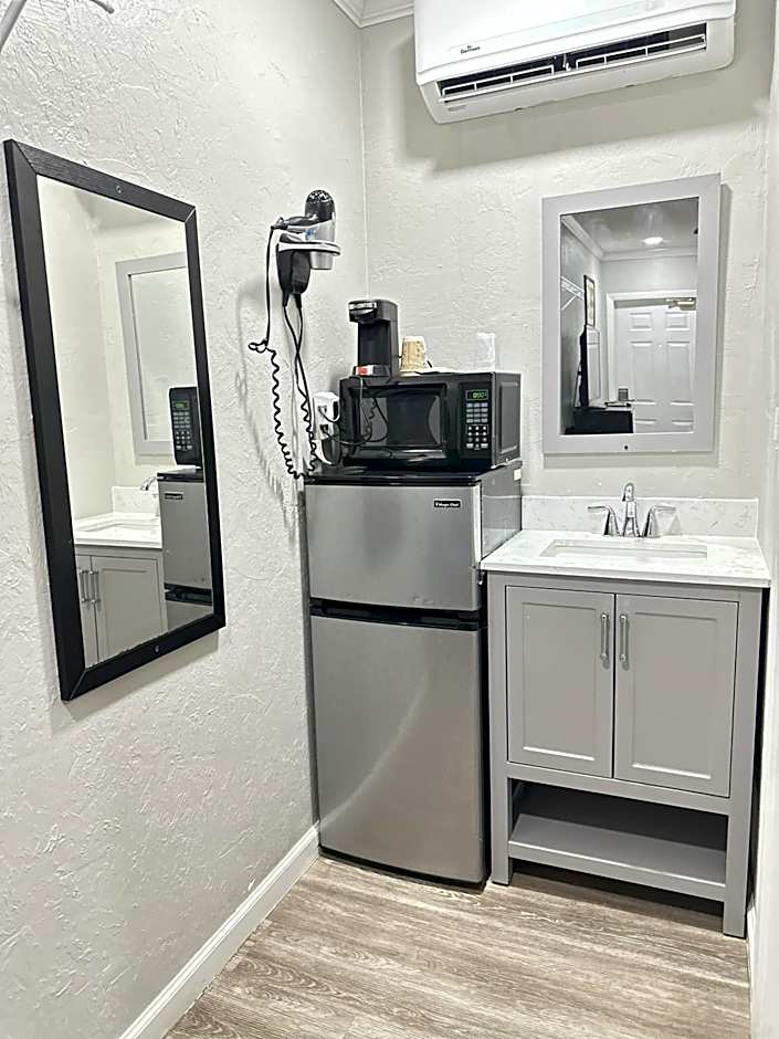 This room features a small refrigerator, microwave, and electric kettle. A flat-screen cable TV is also included.