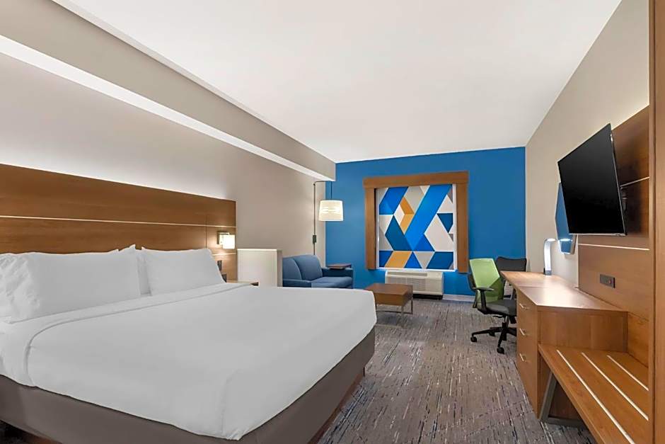 A comfortable guest room featuring one king bed, a flat-screen TV, microwave, and small refrigerator. NO 65 inch flatscreen tv just 42 in. no separate bedroom, no sofa bed.