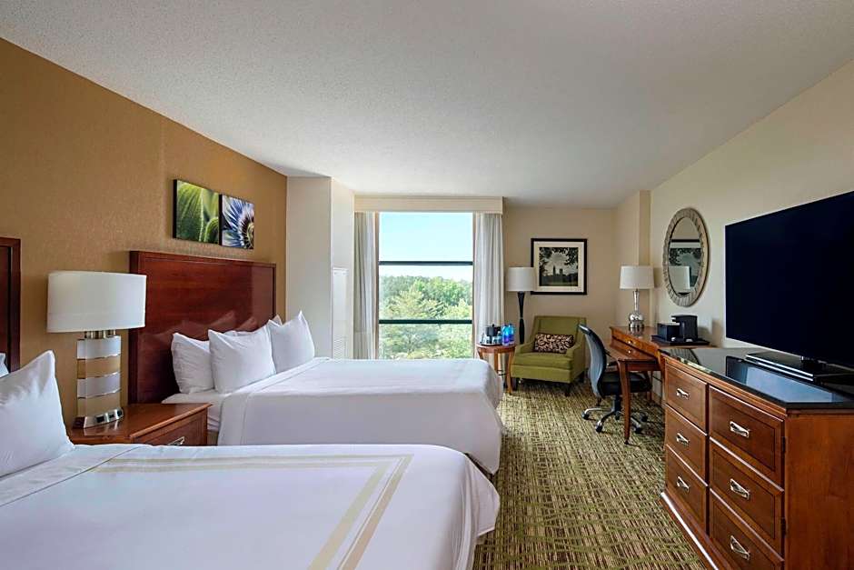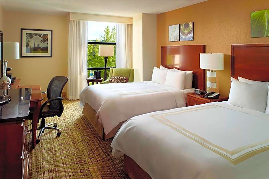 The Atlanta Marriott Alpharetta offers various types of rooms including King Rooms with adapted tub or roll-in shower for mobility accessibility, Double Rooms, and Corner Double Rooms with two double beds. All rooms have a size of 301 sqft or 355 sqft and do not allow smoking. The rooms can accommodate either 3 adults and 2 children or 4 adults and 3 children, depending on the room type.