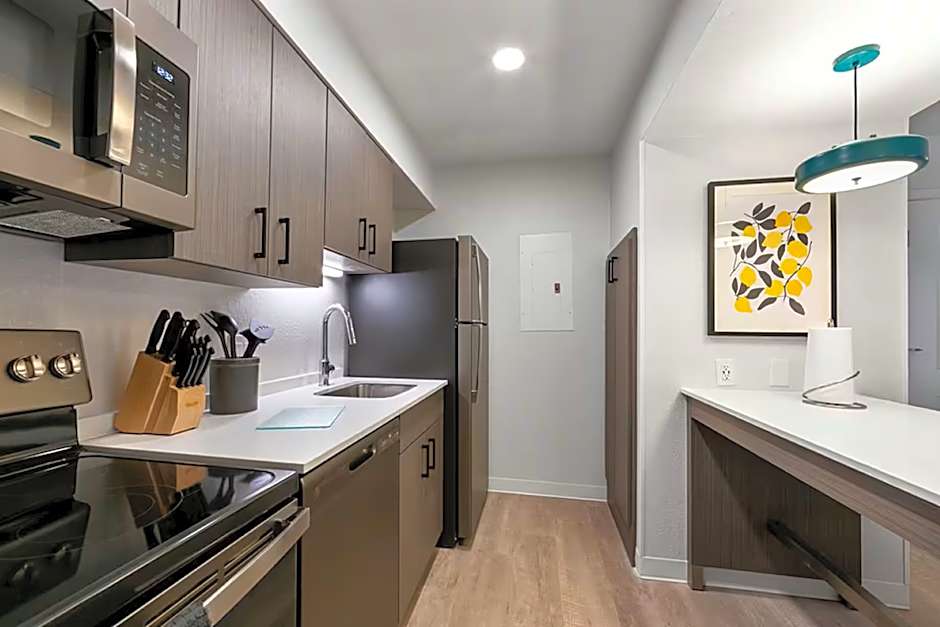 The WaterWalk Atlanta Perimeter Center hotel offers two types of suites: One Bedroom Suite and Studio Suite. Both suites feature a fully equipped kitchen. The One Bedroom Suite is larger, with a size of 549 sqft, while the Studio Suite is slightly smaller, with a size of 452 sqft. Smoking is not allowed in either suite. Both suites can accommodate 2 adults and 1 child and have a king size bed.