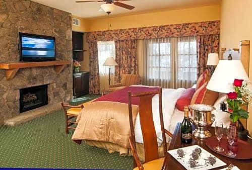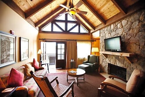 This spacious suite in Legacy Lodge's Villas features a private balcony with a view and a separate seating area with a sofa bed and fireplace. A microwave and small refrigerator are also provided.