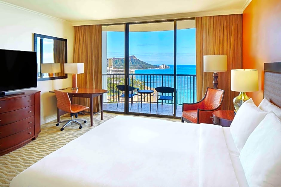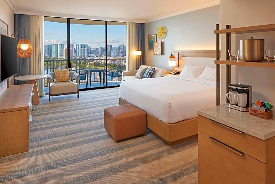 Featuring views of the Pacific Ocean and Honolulu coastline from a private balcony/lanai, a flat-screen TV with premium cable channels and DVD player, a refrigerator and a coffee machine are also included in this air-conditioned room.