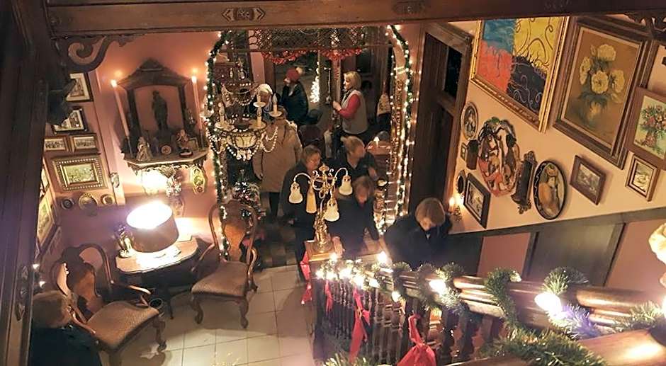This 2nd floor room features two queen beds, an elegant fireplace, and seating area. TV, microwave, fridge and coffee pot are also in the room. Private bathroom.