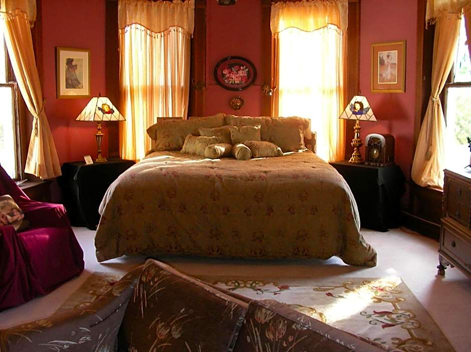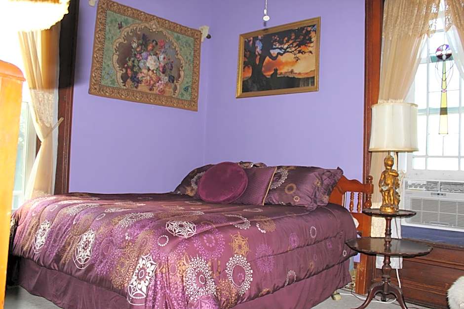 This 2nd floor room features a King bed, decorative fireplace, seating area, and a spectacular view of the river. A fridge, microwave, TV, and coffee maker are included as well. Private bathroom.