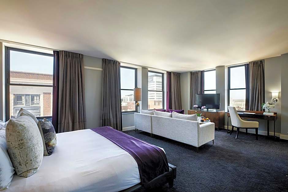 The Ambassador Hotel Wichita, Autograph Collection offers Queen Rooms with Two Queen Beds, Large King Rooms with City View, King Rooms, and Ambassador Suites with City View. The Queen Rooms accommodate up to 4 adults and 3 children, the Large King Rooms and King Rooms accommodate up to 2 adults and 1 child, and the Ambassador Suites accommodate up to 2 adults and 1 child. Smoking is not allowed in any of these rooms. The bed sizes vary, with Queen size beds in the Queen Rooms, King size beds in the Large King Rooms, King Rooms, and Ambassador Suites, and a sofa bed in the Large King Rooms.