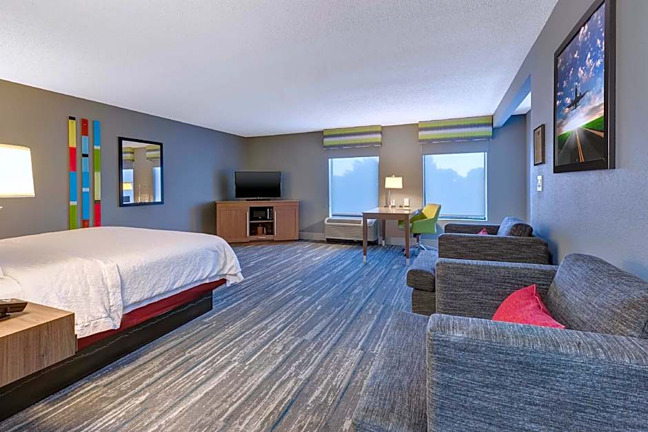 The Hampton Inn Cincinnati Airport-North offers a variety of room types including Queen Rooms with Sofa Bed or Two Queen Beds, King Rooms with or without spa bath, and King Studios. All rooms are non-smoking and have a room size of 323 sqft, accommodating either 3 adults and 2 children or 4 adults and 3 children. Bed options include a King size bed, Double beds, or a combination of King size bed and Sofa Bed.