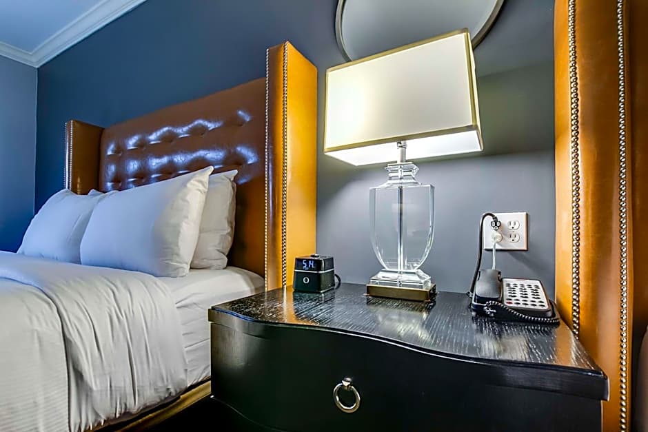 This guest room includes a 55-inch flat screen television, oversize leather headboard with pillow-top mattress, and white tile bathroom.