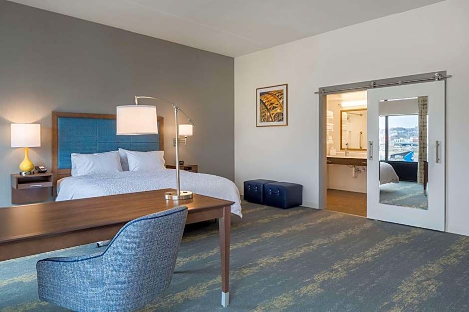 The Hampton Inn & Suites Newport/Cincinnati, KY offers various types of rooms including King Rooms with Sofa Bed and City View, King Studio Suites, King Rooms with Disability/Hearing Accessible features and bath tub, King Suites with City View and Disability/Hearing Accessible features, Queen Rooms with Two Queen Beds and City View, Queen Rooms with Two Queen Beds, and Queen Studio Suites with Two Queen Beds and City View. All rooms are non-smoking and have a room size of 301 sqft. The occupancy of the rooms range from triple to quadruple, accommodating between 3 to 4 adults and 2 to 3 children. The bed sizes available are King size beds, Queen size beds, and some rooms also have a sofa bed.