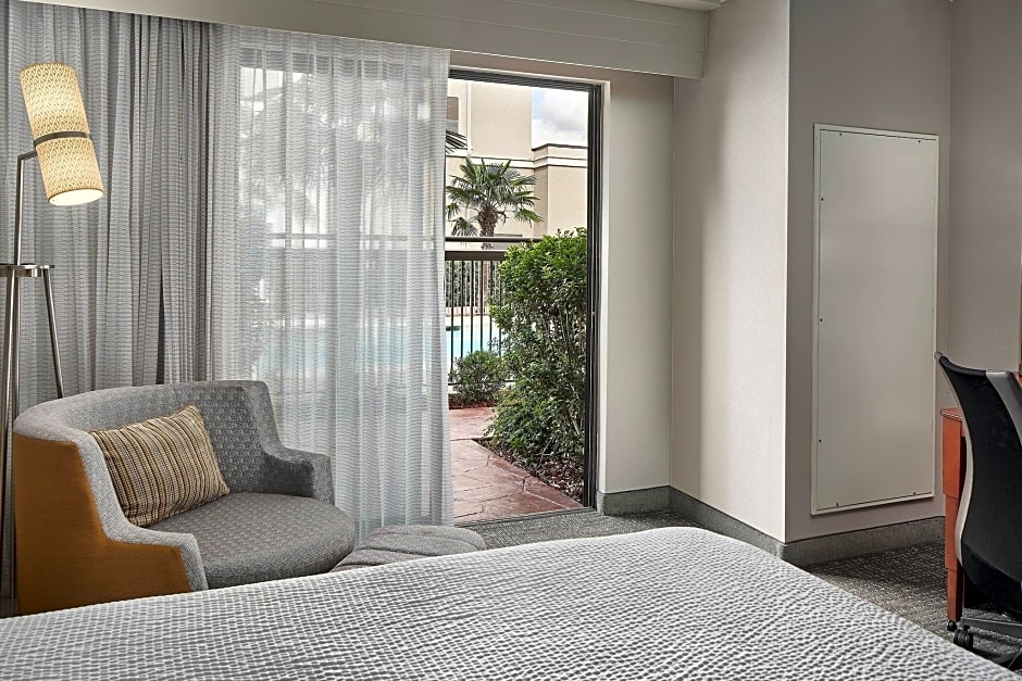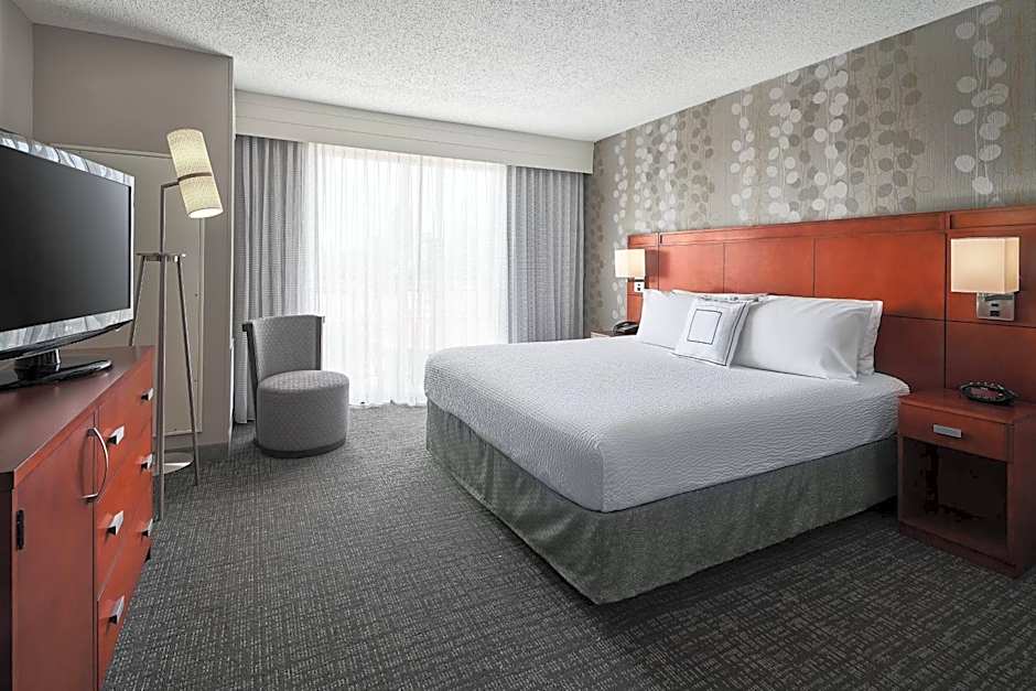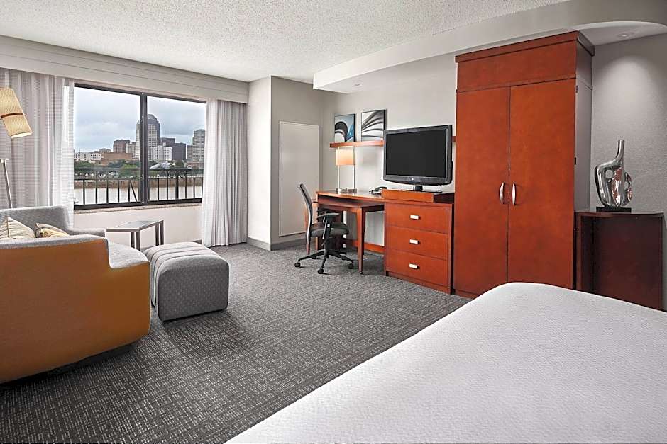The Courtyard Shreveport-Bossier City/Louisiana Boardwalk hotel offers a variety of room options including Queen Rooms with Poolside View, Queen Rooms with Two Queen Beds, King Rooms with Sofa Bed, One-Bedroom King Suites, and King Rooms with Sofa Bed and Downtown/River View. All rooms are non-smoking and have a room size of either 323 sqft or 355 sqft. The rooms can accommodate up to 4 adults and 3 children, and feature either a King size bed or a Sofa Bed.