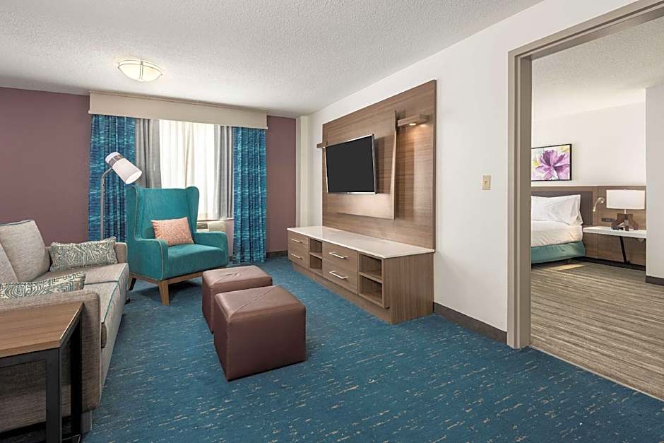 A seating area with a flat-screen TV is featured in this accessible room. It also includes a microwave, fridge, and coffee maker.