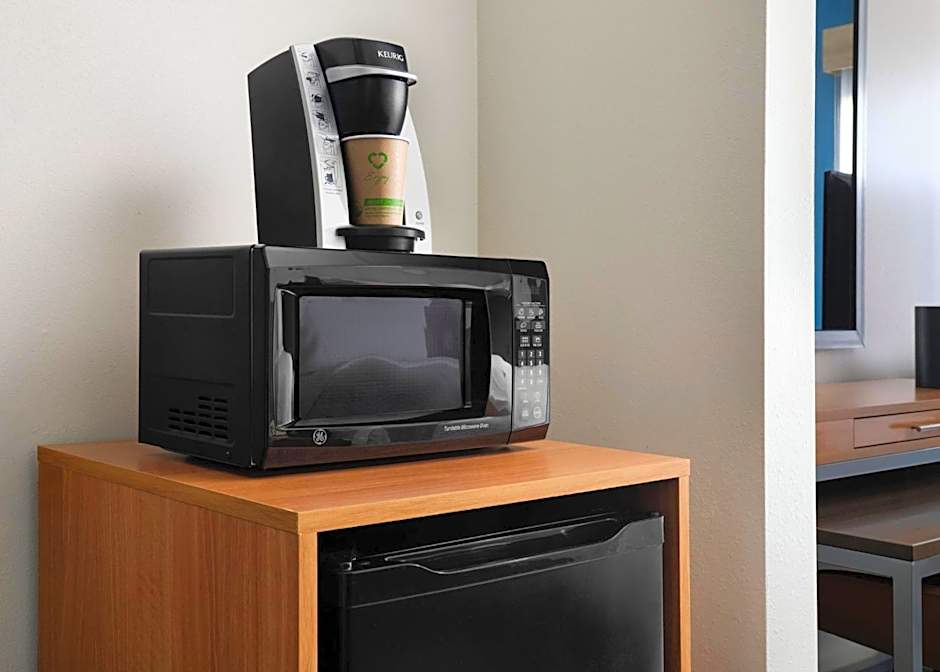 A cable TV with premium channels,a microwave, and a small seating area are featured in this guest room.