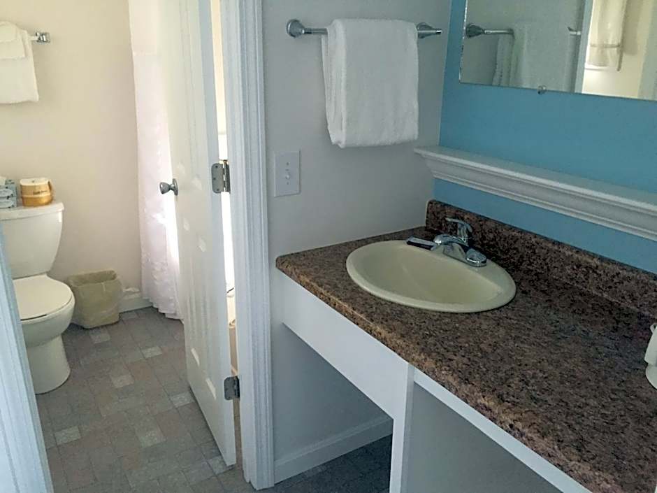 This suite features a kitchenette with a 2-burner stovetop, microwave, and refrigerator.