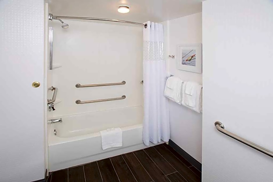 This mobility and hearing accessible, non-smoking one bedroom suite features one king-sized bed, and an accessible roll-in shower. The suite also has a visual alarm and notification devices for the doorbell or door knock and incoming phone calls. The room features include a microwave, refrigerator, wet bar, comfortable soft seating, a HDTV, and easy to operate alarm clock/radio. The free high-speed internet access will help you stay connected while on the road. If you prefer not to work at the desk, you can use the convenient lapdesk instead. You'll also enjoy the convenience of having a coffeemaker with tea service and iron/ironing board in your room. Any corresponding photo may not reflect the specific accessible room type or room feature.