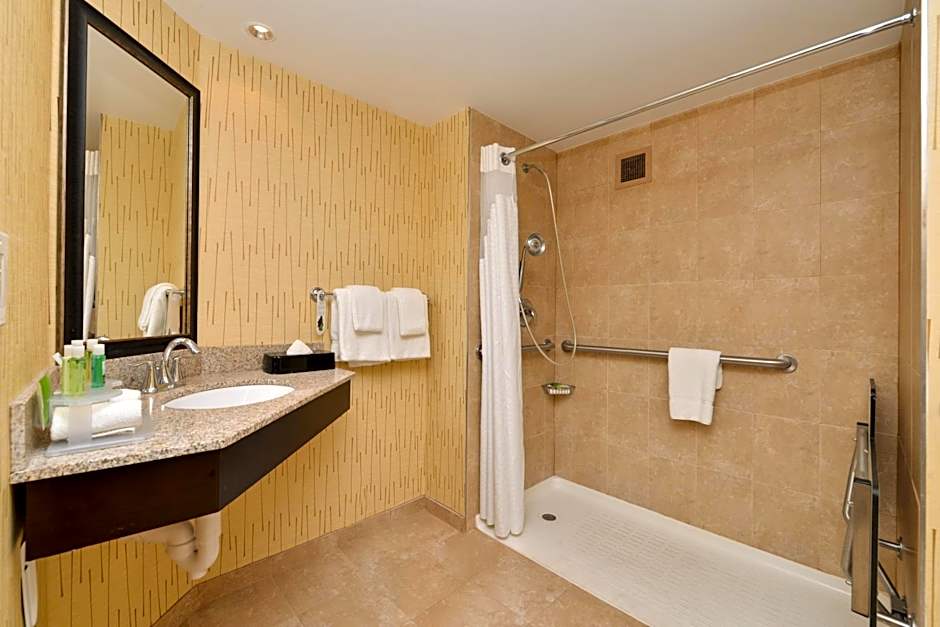 This hearing accessible room features a king bed, roll-in shower, complementary wireless internet, flat-screen TV with cable channels, microwave, refrigerator, work desk, alarm clock, radio, coffee maker, hair dryer, coffee maker, iron and ironing board, and telephone.