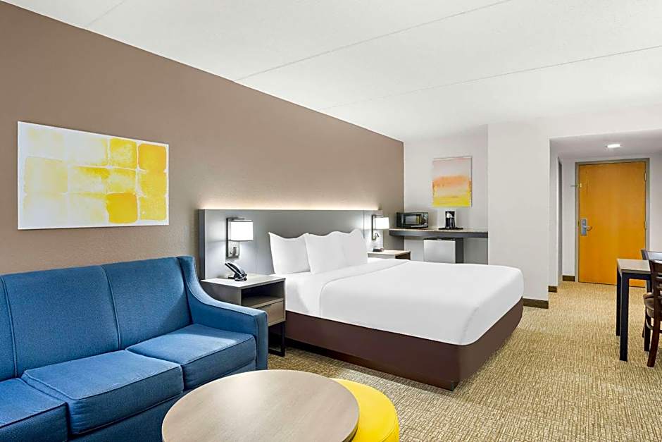 This room features a microwave, refrigerator and sofa bed.